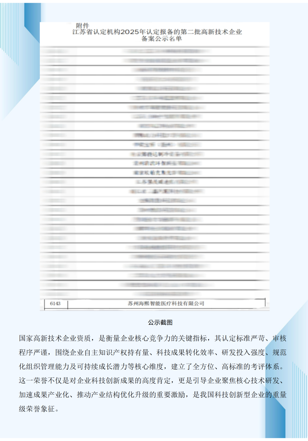 近日,国家高新技术企业认定管理工作网发布《对江苏省认定机构2025年认定报备的第二批高新技术企业进行备案的公示》,